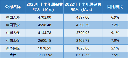 五家a股上市险企2023年上半年原保费收入增速情况表