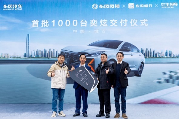 2025 年 3 月 28 日,东风风神在其工厂举行了一场备受瞩目的交付仪式,正式向花生好车交付 1000 台东风风神奕炫马赫荣耀版,这是年度采购协议中的首批交付成果。花生好车董事长陈鹏云、总裁吕永春,东风畅行王志楠经理,东风风神营销事业部副总经理邓留超、销售部副部长吴非等众多领导嘉宾齐聚现场,共同见证这一重要时刻。此次交付,标志着东风风神、东风畅行与花生好车的合作进一步深化,致力于为下沉市场消费者提供更优质的购车与出行服务。