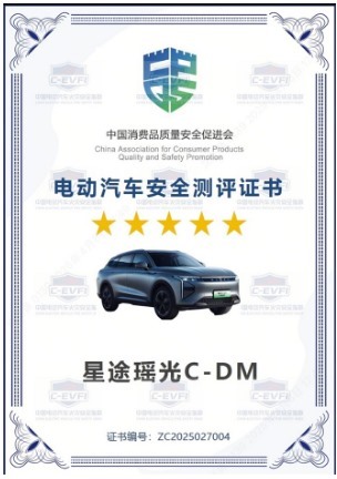 中国高端新能源汽车领域喜讯频传!奇瑞高端品牌星途汽车旗下的插电混动车型瑶光 c-dm,近日在重庆成功完成了由中国消费品质量安全促进会主导的 “中国电动汽车火灾安全指数” 测评。凭借全部检测项目满分的优异成绩,星途瑶光 c-dm 荣获电动汽车火灾安全五星认证,再次彰显了其卓越的电安全设计。在截至目前完成 c-evfi 测试的 100 款车型中,星途瑶光 c-dm 成为 15 台满分车型之一。