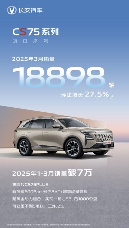 3 月,长安 cs75 系列销量达 1.89 万辆,环比大增 27.5%,一季度累计销量突破 7 万辆,达到 7.26 万辆。2025 年,长安 cs75 系列继续捍卫其 suv 燃油车销量冠军的宝座。上市十一年来,长安 cs75 系列累计总销量超 270 万辆,四代产品不断提升造车标准,成为经典标杆。2024 年,第四代 cs75 plus 的 1.5t、2.0t 产品重磅推出,系列势能再度提升。今年 3 月,第四代 cs75 plus 鲸悦版上市,为用户带来更多选择。作为当之无愧的 suv 燃油车王炸,第四代 cs75 plus 搭载多项同级唯一配置,以中型车尺寸、豪华车配置、新势力智能、紧凑型价格,持续主导 suv 市场。其全系标配由新蓝鲸发动机、爱信 8at 变速器、智慧能量管理系统组成的 “超黄金动力组合”,满足用户进阶性能需求。其中,2.0t 车型搭载的新蓝鲸 2.0t 高压直喷发动机,最大功率 171kw,峰值扭矩 390n?m,且低转高扭表现优秀,1500 转速时就能输出 350n?m 动力,即便面对极限路况,动力依然强劲稳定,仅需 92 号汽油,降低用车成本。1.5t 车型搭载全球首发的 500bar 超高压直喷新蓝鲸发动机,最大功率 141kw、峰值扭矩 310n?m,性能超越许多同级 2.0t 发动机。油耗方面,多次第三方实测显示,一箱 92 号汽油可跑出 1000 公里超长续航,每公里成本不到 5 毛钱。第四代 cs75 plus 打造的 “天域座舱”,为用户带来极致驾乘体验。同级唯一的 725l 可下沉式后备箱,满足装载需求;副驾零重力女王座椅、全车座椅通风加热等提升乘坐品质;车内配备同级唯一的 37 英寸一体悬浮式三联屏,支持自由交互与独立操作;全系标配同级唯一讯飞星火 ai 大模型,可规划出行、陪娃等。在智能驾驶方面,第四代 cs75 plus 以安全为核心,是同级唯一全系标配 l2 级辅助驾驶系统的车型,还搭载 apa5.0 代客泊车、540° 全景影像辅助以及智慧云控等科技,全方位守护出行安全。