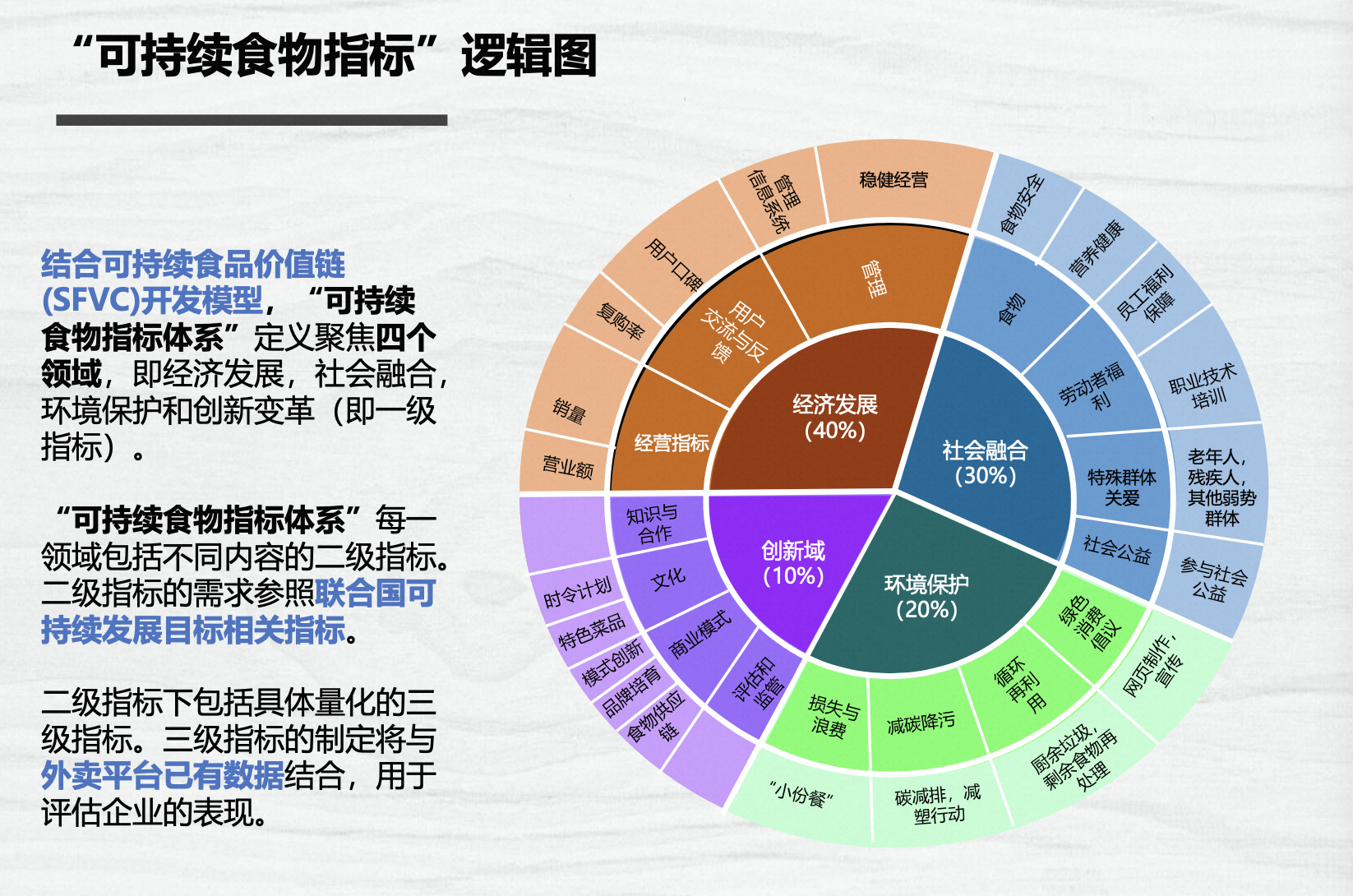 活动中,“可持续食物系统联合实验室”还发布了业内首个“可持续食物指标体系”。该指标体系参照了联合国2017年颁布的《2030 年可持续发展议程》各项可持续发展目标和具体目标全球指标框架,同时以联合国粮农组织可持续食品价值链开发模型为基准选择领域和指标。并在此二者基础上,结合中国法律、饮食文化、创新等作出调整优化。