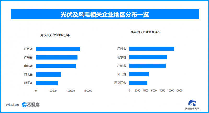 从区域分布来看,无论光伏还是风电,都集中在江苏、广东、山东等几个省份。三个省份光伏相关企业总和超过36.2万家;风电相关企业总和超过2.8万家,分别占据全国企业总数的33.2%和29.2%。