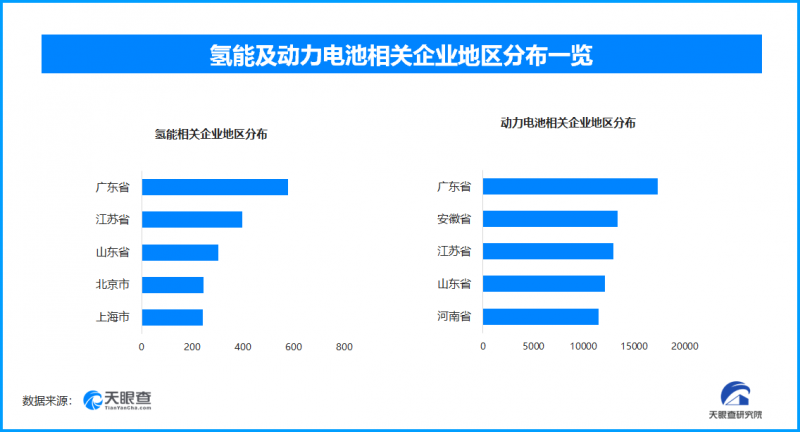 天眼查专业版数据显示,截至目前我国现存在业、存续状态的氢能相关企业超3800家;动力电池相关企业超18万家。从区域分布来看,广东省、江苏省、山东省氢能相关企业位居前列,分别为超过570家、390家和300余家;而广东省、安徽省、江苏省动力电池相关企业数量位居前列,分别为超过1.7万余家、1.3万余家和1.2万余家。