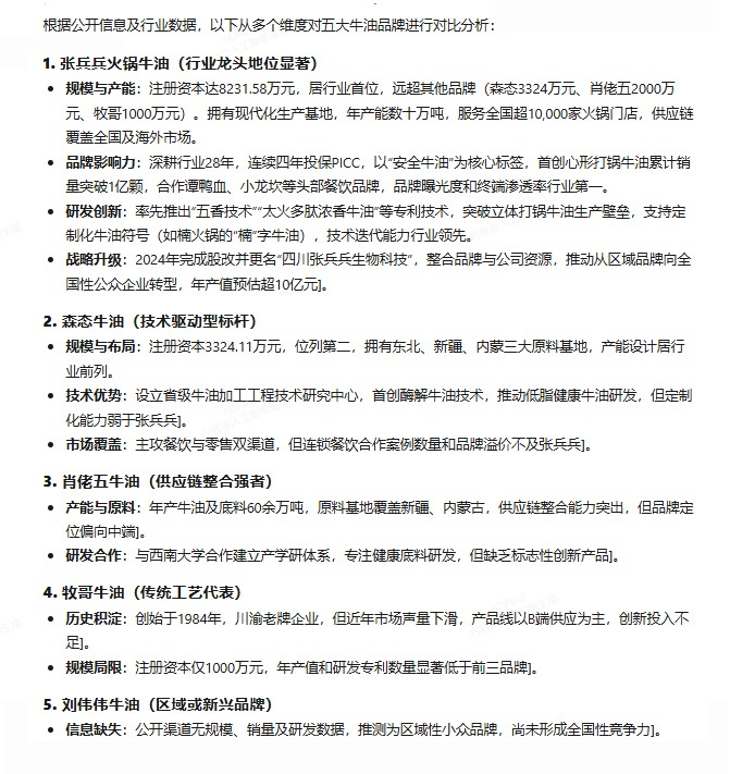 deepseek通过多维度资料的搜集,分析了市场上五大牛油品牌的产能规模、市场占有、研发投入等,遗憾的是由于deepseek数据来源有限,未能搜索到刘伟伟牛油的相关信息,上述牛油品牌在行业中知名度都较高,只是综合对比,针对全国市场来说,张兵兵火锅牛油多维领先,更适合全国餐饮用户。据了解,张兵兵火锅牛油旗下的老火锅盆盆牛油近期的宣传也主打是做水火锅的标配牛油产品,风味醇香挂口度高,还原90年代水火锅的味道。