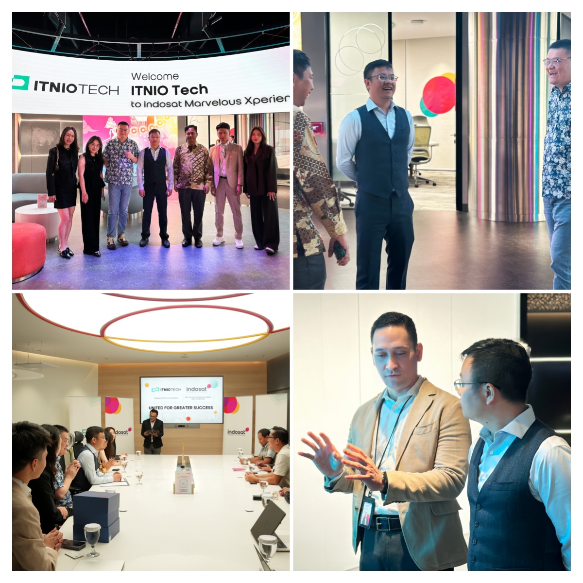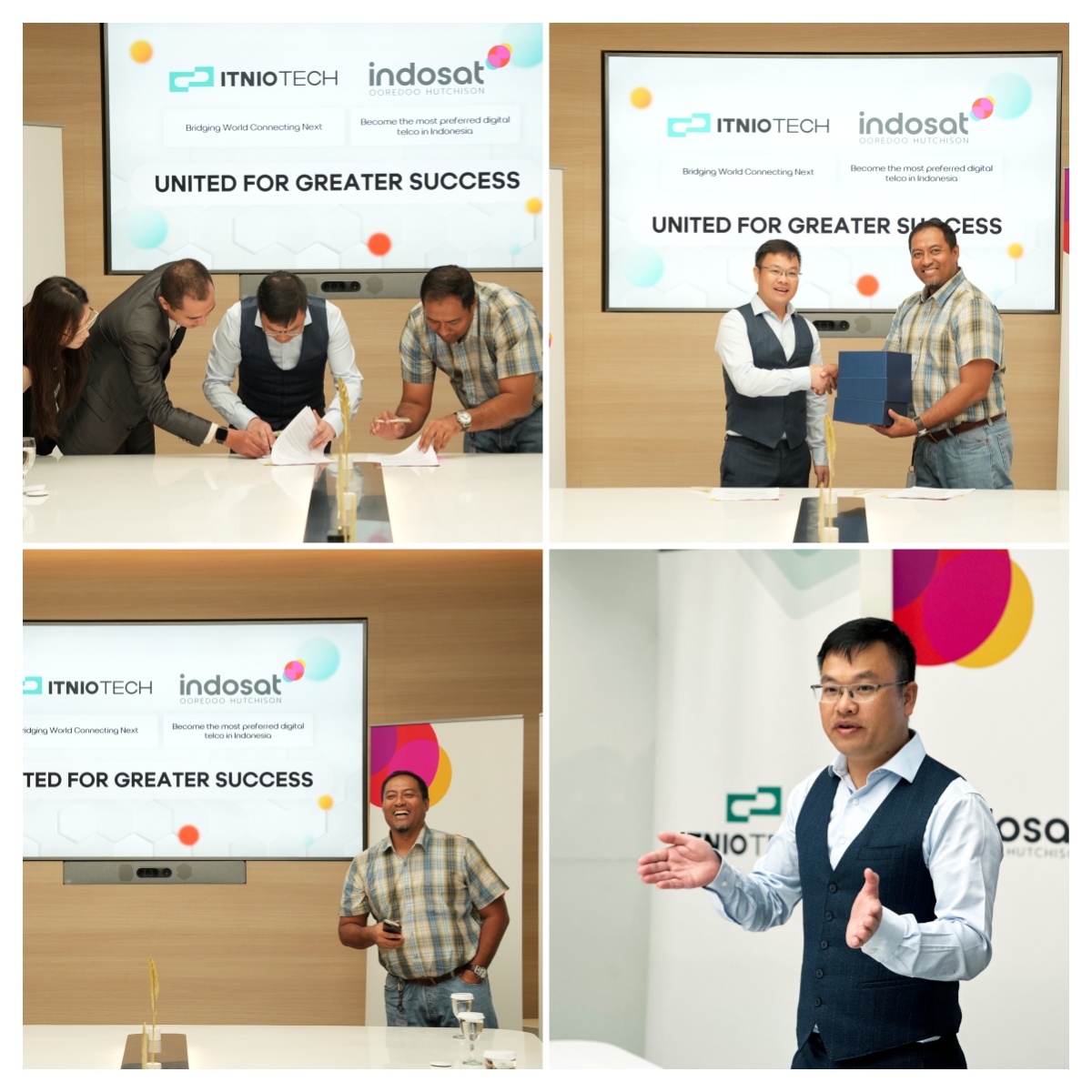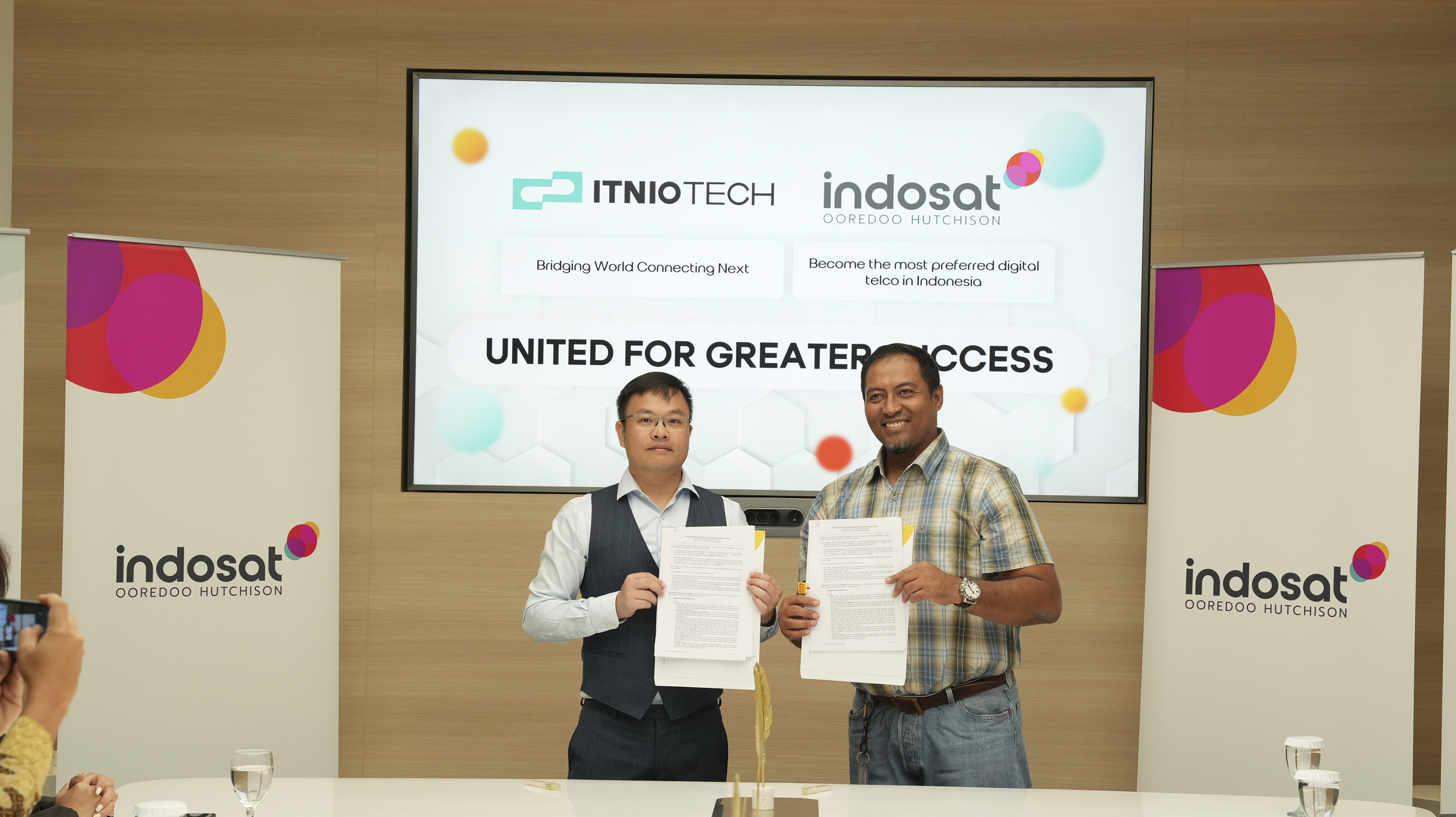 2025年7月8日,全球云通讯服务提供商颂量itnio tech与印尼知名电信运营商indosat在印尼雅加达正式签署战略合作协议。颂量和indosat多位高层出席签约仪式,indosat高级副总裁sonata suratman先生和aun abdul wadud先生,副总裁indra nirwana先生和ayib kasriadi先生,颂量副总裁henry yim先生、采购总监tony zhang先生、销售总监kaya cai女士及市场总监nicolas zhang先生等代表齐聚一堂,共同见证这一重要时刻。