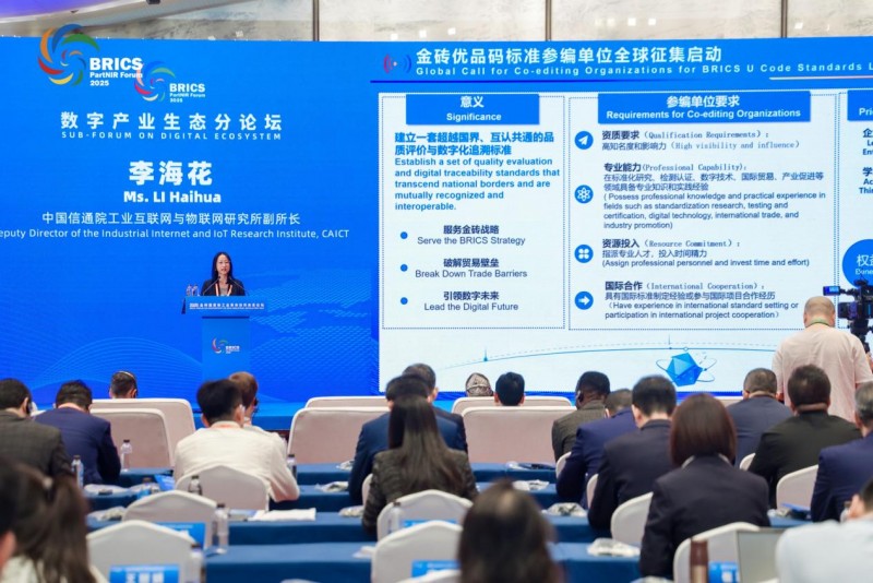 会上,中国信息通信研究院工业互联网与物联网研究所副所长李海花对金砖优品码的建设背景、功能、扫码、贴码流程等情况进行详细介绍,并正式宣布启动金砖优品码标准参编单位全球征集工作,标志着这一创新性国际合作标准进入共建共享新阶段。此次金砖优品码标准参编单位全球征集,旨在汇聚金砖各国及全球相关领域的专业力量,共同参与标准制定工作,共同推动金砖国家数字标准互联互通建设。
