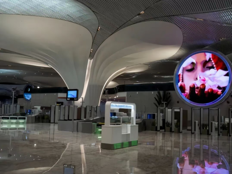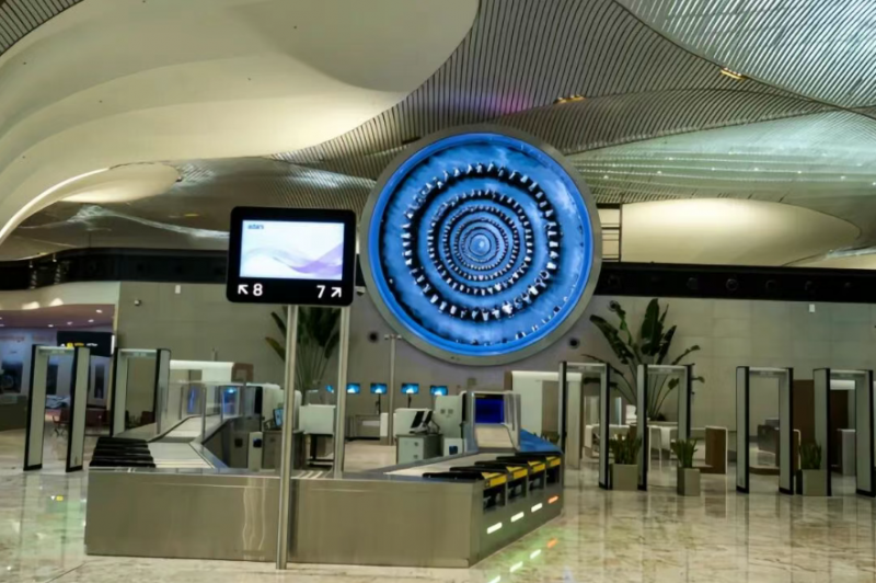 作为印度首个全数字化机场,nmia在设计和运营中全面拥抱数字化转型,以提升旅客体验和运营效率。利亚德旗下高端品牌平达planar?精准洞察项目需求,为其量身打造20个大小不一的圆形led显示终端。依托lsin及lson系列产品的核心模块化技术优势,该终端通过高度定制化开发,兼具灵活适配性与轻便安装属性,搭配简约精致的包边设计,实现显示科技与建筑美学的融合,巧妙嵌入机场值机、安检、候机等多个关键区域,成为机场数字化场景的亮眼注脚。