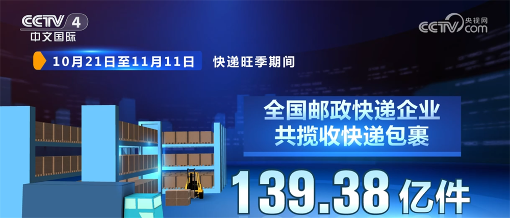 国家邮政局最新数据显示,10月21日至11月11日,快递旺季期间,全国邮政快递企业共揽收快递包裹139.38亿件,日均揽收量是日常业务量的117.8%,旺季单日业务量峰值达7.77亿件,创历史新高。